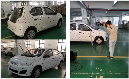 流程: 以下圖掃描整車為例,首先,為整車布點,并用全局攝影測量系統(tǒng)獲取標記點的空間三維數(shù)據(jù)。